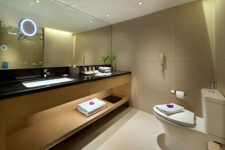 Delightful modern Executive suite designed with wooden floor as well as living room with comfortable sofa bed. The Junior Suites offer a true taste of contemporary modern elegance in size of 73 m2. Equipped with a satellite-channel TV, a laptop-sized safe deposit box, IDD telephone, hair dryer, bottles of mineral water, bathrobes & slippers, mini-bar fridge, high speed internet, TV cable and evening turn down service by housekeeping team to invite you for a relax and memorable stay.