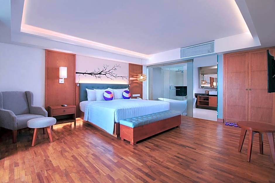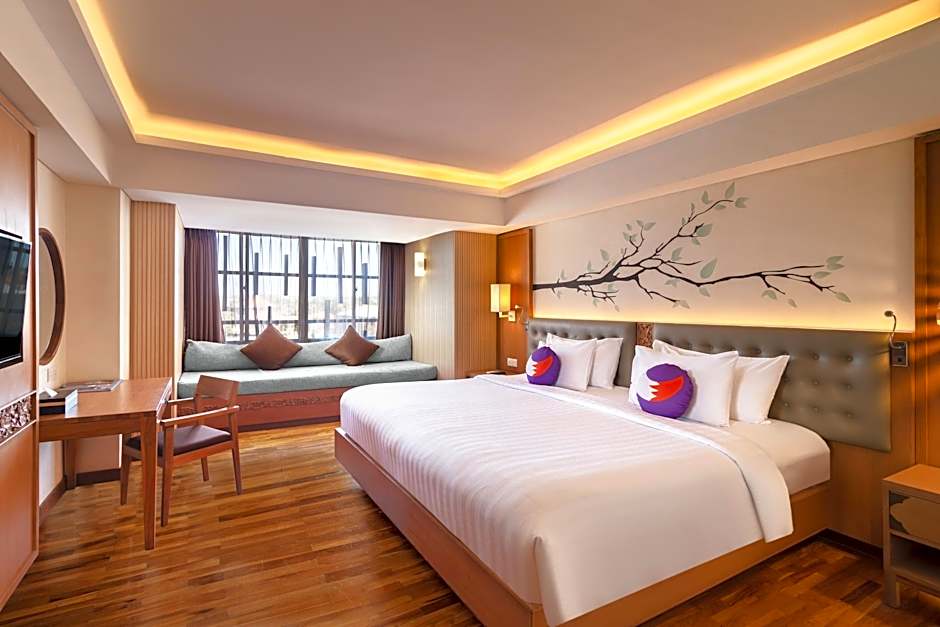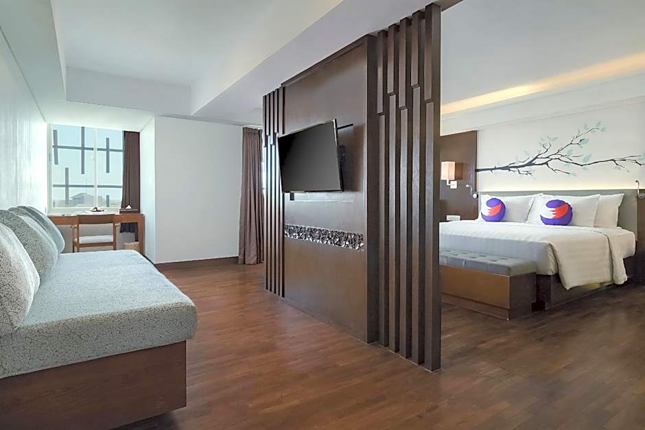 Delightful modern Executive suite designed with wooden floor as well as living room with comfortable sofa bed. The Junior Suites offer a true taste of contemporary modern elegance in size of 73 m2. Equipped with a satellite-channel TV, a laptop-sized safe deposit box, IDD telephone, hair dryer, bottles of mineral water, bathrobes & slippers, mini-bar fridge, high speed internet, TV cable and evening turn down service by housekeeping team to invite you for a relax and memorable stay.